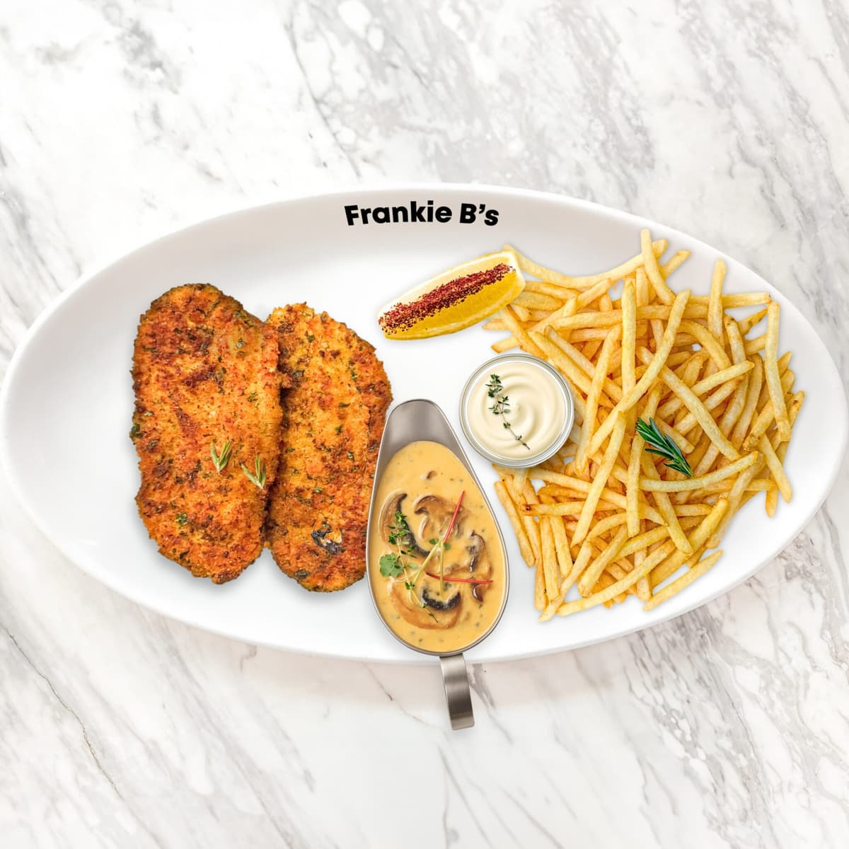 chicken cotoletta, funghi sugo, sumac lemon, choice of side