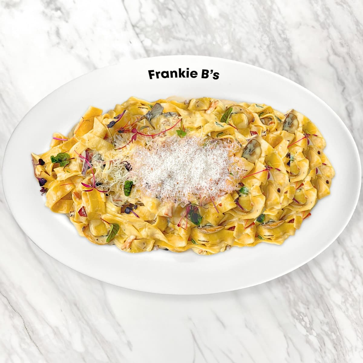 chicken, garlic, gorgonzola, mushroom, parmesan butter cream, parsley, grated parmesan